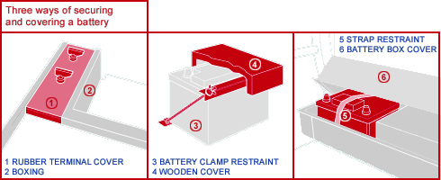 To stop batteries from moving around, which could cause damage to their terminals and connections, or cause them to spill corrosive liquids over the boat, they must be securely fixed.