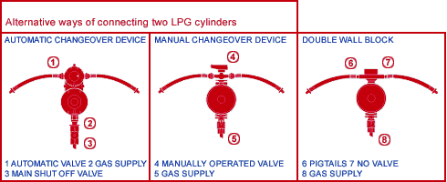 To ensure that the LPG supply can be cut off in an effective way, the valve of any LPG cylinder or of a connected low pressure regulator can be used as the main shut-off valve. If there are two or more LPG cylinders connected by an automatic changeover device, the main shut-off valve must be situated as close to its outlet as practical.